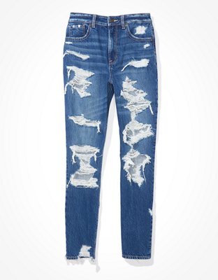 Black Ripped Mom Jeans / High waist raw hem ripped mom jeans.